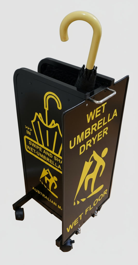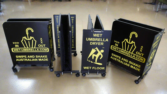 Wet Umbrella Dryer Wet Floor Model Aluminium Australian Made Yellow Stickers